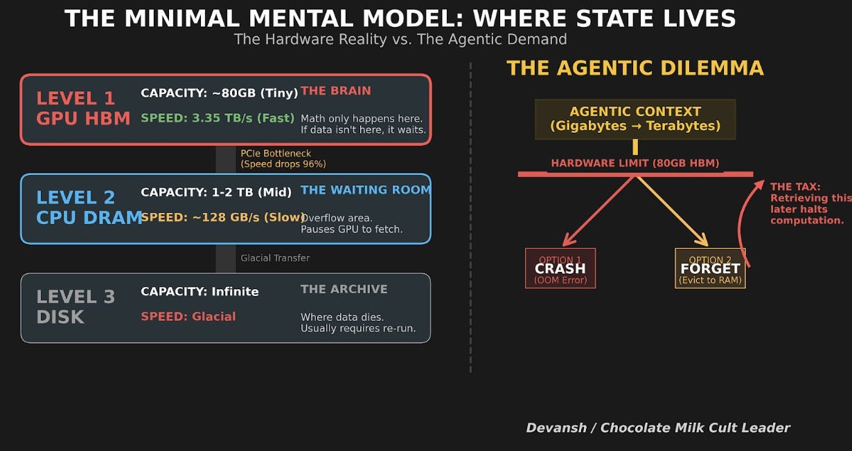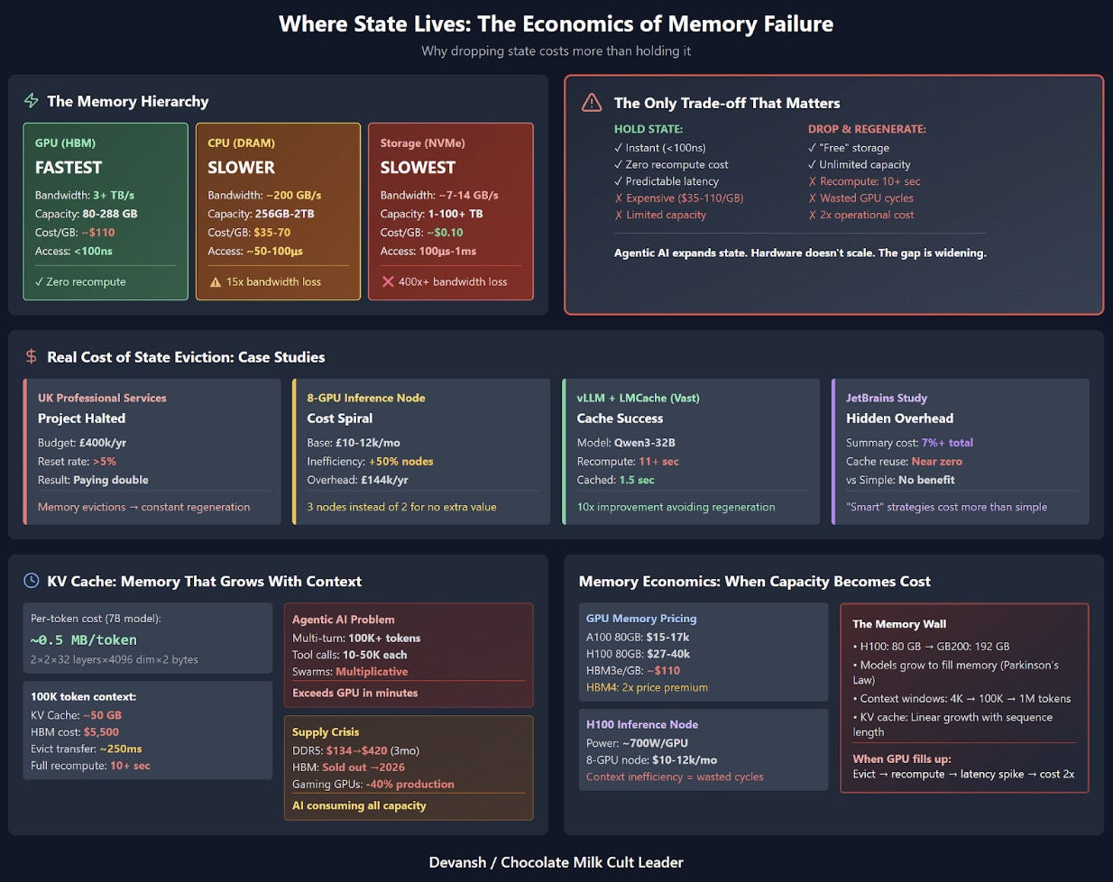 When GPU memory fills up, state gets pushed to CPU memory. When CPU memory fills up, state gets pushed to storage or simply dropped. And when state gets dropped, the system has to regenerate it — which means redoing the work that created it in the first place. This is the only trade-off that matters at the infrastructure level: hold state, or redo work.