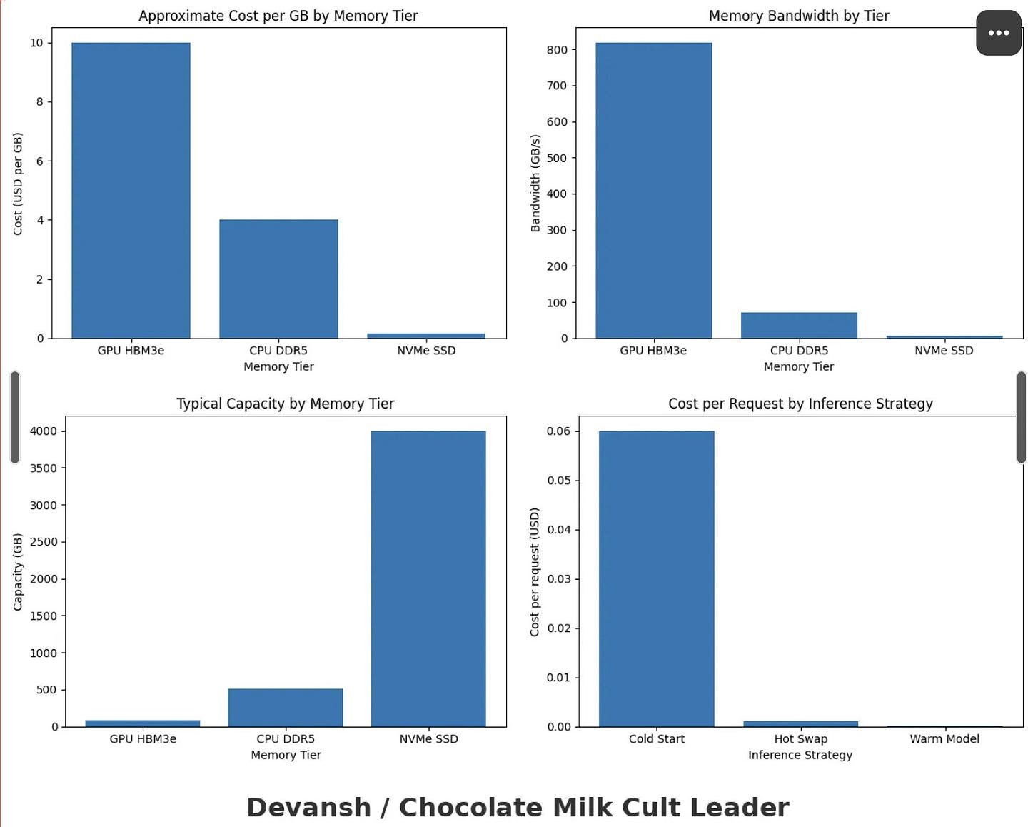 ^^Running a cold start on a GPU (loading the model from scratch) costs roughly 160 s in TTFT — about $0.06 per request at $1.35/hour. Hot‑swapping (loading from CPU memory) takes ~2.9 s (≈$0.0011), and a warm model is near‑instant at ~0.17 s (≈$0.00006).