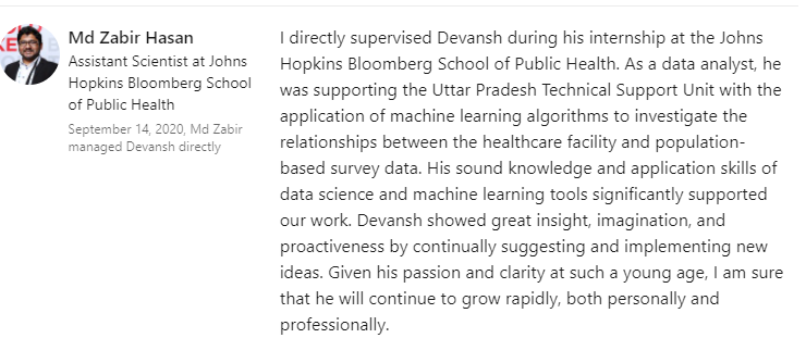 In Jun 2020, I worked at Johns Hopkins University. This was by far the hardest project I had worked on yet. We were analyzing the health systems of a State Government to evaluate the impact of different government policies. There were 200+ features, lots of missing data, and tons of noise. It was hard work, but we were ultimately able to do some really good work.